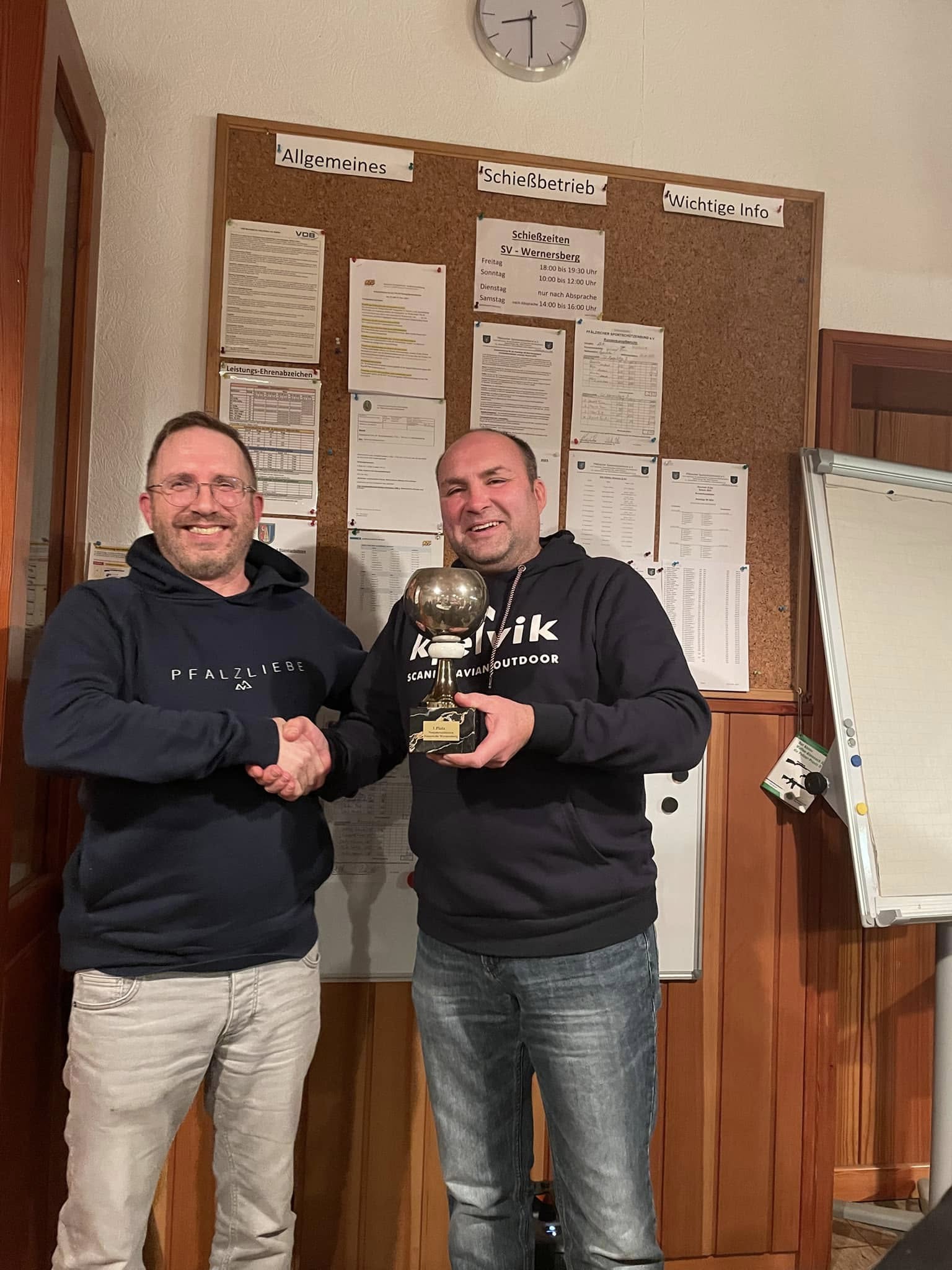 Jan Klein (rechts) überreicht dem Schützenkönig 2025 Marco Hoffmann (links) den Pokal der freiwilligen Feuerwehr Wernersberg.